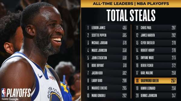 格林季后赛抢断数超越伦纳德跻身历史前20 詹姆斯稳居榜首