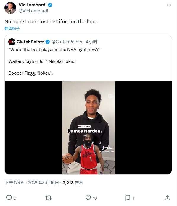 作为本赛季助攻王(场均8.5次助攻)兼历史得分榜第22位的保持者,哈登的常规赛数据确实亮眼。但丹佛掘金跟队记者维克·隆巴迪对此持有保留态度,他在转发视频时暗含机锋:"或许我们该重新评估这位年轻人的篮球洞察力。"这番言论或与刚结束的季后赛首轮较量相关——卫冕冠军掘金经历七场鏖战,最终以4-3将哈登效力的快船淘汰出局。