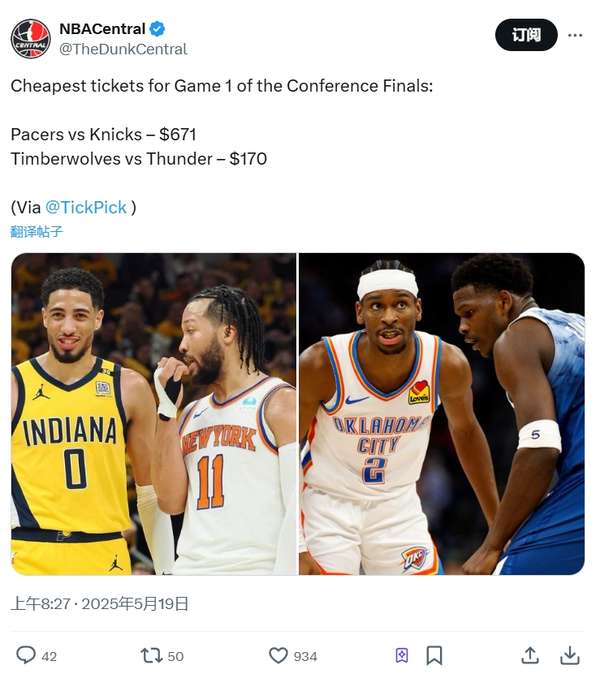 NBA分区决赛票价悬殊:尼克斯主场均价超雷霆四倍 麦迪逊广场一票难求