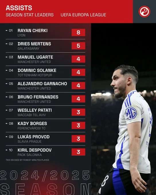 红魔三将闪耀欧联助攻榜 里昂新星领跑群雄