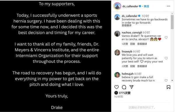 迈阿密国际主力门将完成疝气修复术 医疗团队披露术后恢复方案