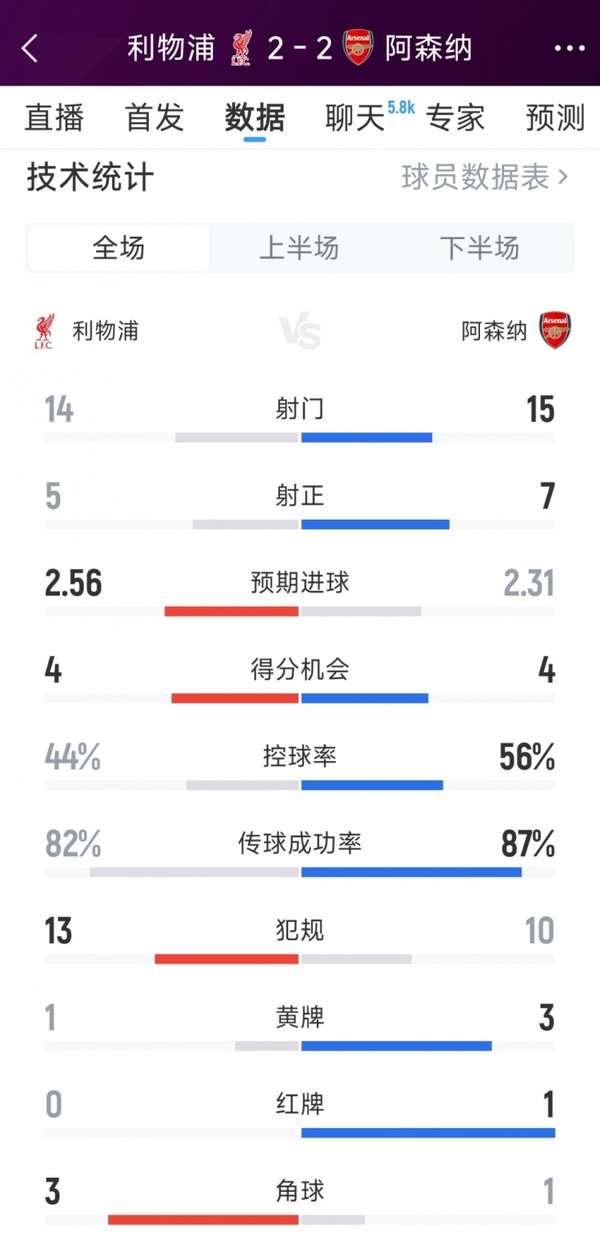 来源:360直播2025-05-12 01:28:52英超第37轮焦点战役在安菲尔德球场打响,利物浦与阿森纳上演了一场跌宕起伏的战术博弈。当主裁判迈克尔·奥利弗吹响终场哨时,记分牌定格在2-2的比分,但统计数据揭示出这场平局背后暗藏的玄机。