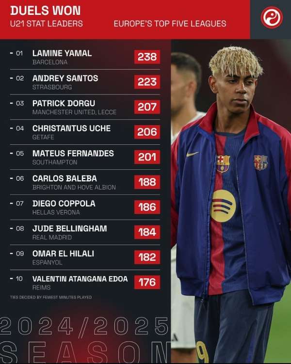 来源:360直播2025-05-13 00:25:58在欧洲足坛新老交替的浪潮中,2023-24赛季五大联赛U21球员对抗数据引发业界关注。权威数据机构Squawka最新发布的技术指标分析显示,巴萨16岁新星亚马尔以238次成功对抗的惊人表现,刷新了青年球员的对抗效率标准,其数据较第二名安德烈-桑托斯(斯特拉斯堡)多出15次。