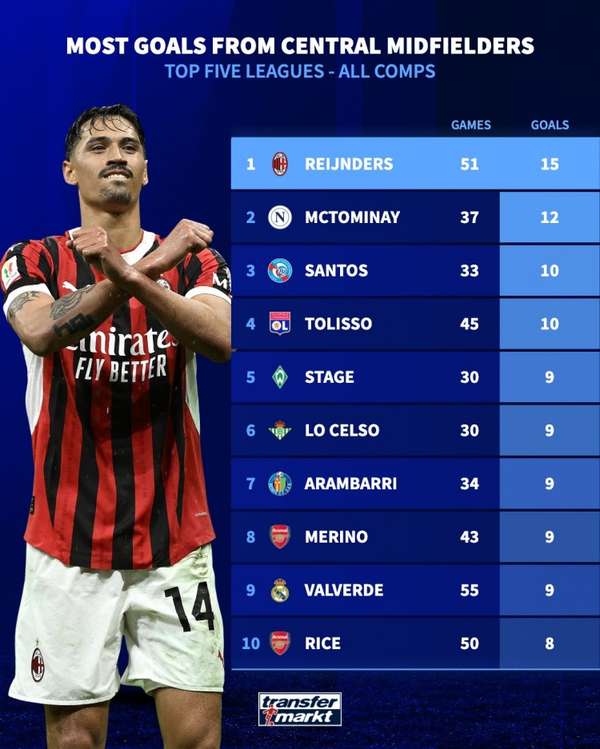 来源:360直播2025-05-14 16:54:55权威数据平台德国转会市场日前更新了本赛季欧洲顶级联赛中场中路球员进攻数据,引发战术分析界关注。该统计特别排除了传统进攻型中场角色,聚焦以组织调度为核心职能的球员破门效率。值得留意的是,AC米兰的荷兰国脚赖因德斯以15粒进球强势登顶,成为本赛季该位置最具杀伤力的存在。