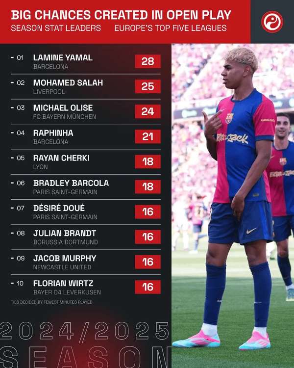来源:360直播2025-05-15 23:30:18欧洲足坛本赛季运动战进攻效率的竞争格局因一位超新星的崛起发生震荡。知名数据机构Squawka最新发布的统计显示,巴塞罗那青训营出品的16岁右边锋亚马尔以28次运动战绝佳机会创造量,成为五大联赛该项数据的领跑者。这位尚未完成职业首季的少年球员,其关键传球效率已超越利物浦锋线核心萨拉赫(25次)和拜仁慕尼黑新援奥利斯(24次)。