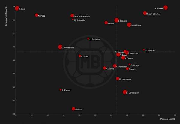 来源:360直播2025-05-16 13:33:13随着英超联赛第36轮战罢,DataMB数据建模公司通过交叉分析揭开了守门员群体攻防两端的竞技密码。该公司采用每90分钟传球次数与扑救成功率构建的双轴坐标系显示,布伦特福德的荷兰国门弗莱肯以75.3%扑救成功率与28.6次传球的平衡表现,成为本赛季唯一在两项指标均进入前五的门将。