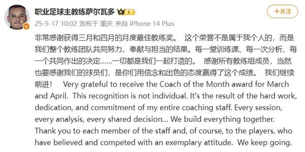 来源:360直播2025-05-17 10:26:31在2025华润饮料中甲联赛最新公布的月度评选中,重庆铜梁龙主帅萨尔瓦多凭借3-4月执教期间带队取得的5胜1平不败战绩,成功摘得最佳教练殊荣。这位西班牙籍教头在个人社交平台发表感言时,特别强调荣誉属于整个团队。