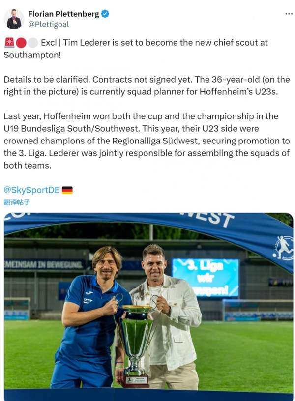 值得关注的是,莱德勒在霍芬海姆梯队建设中的卓越表现成为其获得重用的关键砝码。作为俱乐部U23与U19梯队的双重架构师,他主导打造的青训体系连续两年创造辉煌:2022-23赛季率U19梯队包揽德甲南部/西南赛区双冠王,本赛季更带领U23梯队问鼎西南地区联赛冠军,成功斩获德丙入场券。