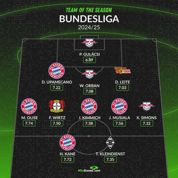 来源:360直播2025-05-19 20:00:30随着德甲赛季大幕落下,权威数据机构WhoScored近日公布了基于球员综合评分的赛季最佳十一人名单。在这份汇聚联赛精英的阵容中,拜仁慕尼黑展现传统豪强底蕴,共有五名球员成功入围,成为最大赢家。