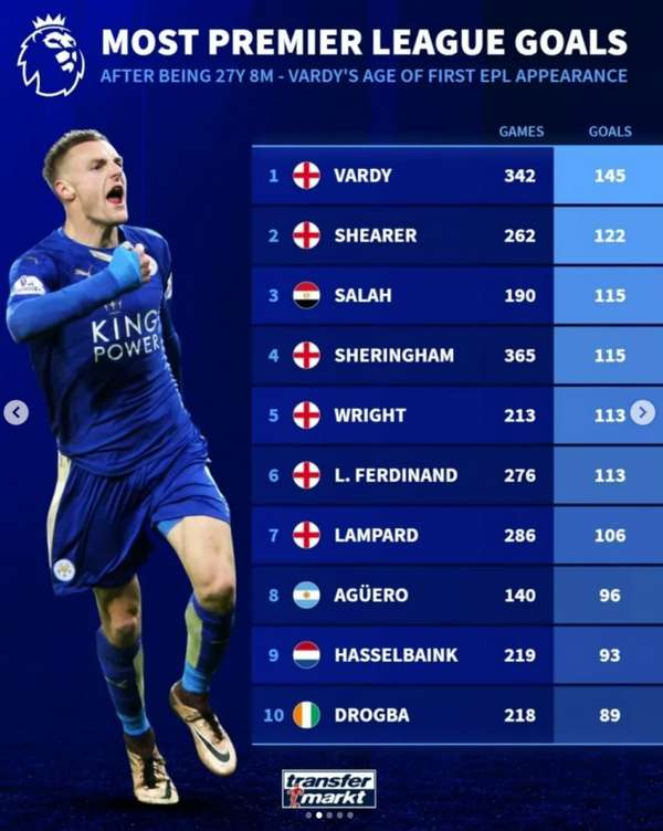 英超大龄射手王座争夺战:瓦尔迪145球霸榜 希勒萨拉赫紧追