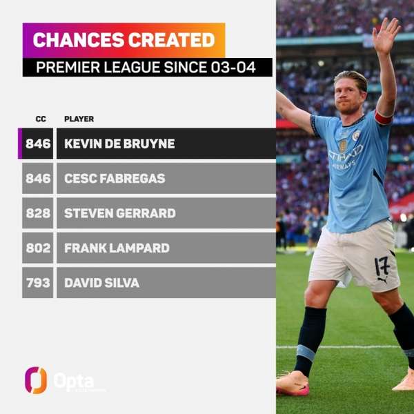德布劳内登顶英超历史助攻榜 846次威胁传球改写联赛纪录
