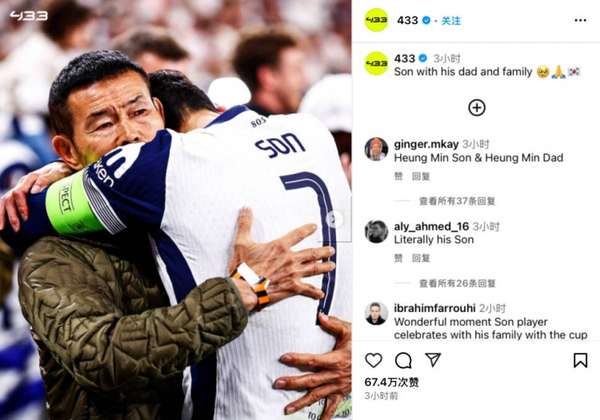 比赛终场哨响后,一个温馨的瞬间被镜头捕捉:身披热刺战袍的孙兴慜快步走向场边,与专程前来观战的父亲孙雄正深情相拥。据知名足球媒体"433"报道,这个拥抱持续了将近30秒,孙兴慜的眼眶明显泛红。