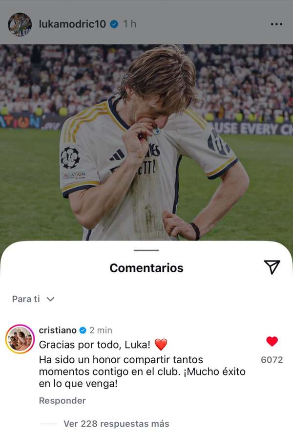 来源:360直播2025-05-22 23:24:24著名足球运动员卢卡·莫德里奇近日通过个人社交媒体宣布,将在世俱杯赛事后结束在皇家马德里的职业生涯。这一决定引发了足坛广泛关注,其中就包括他的前队友克里斯蒂亚诺·罗纳尔多。