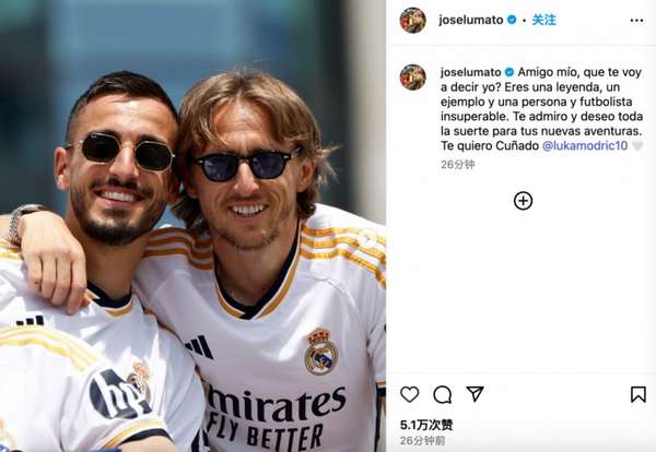 何塞卢社交媒体深情告别莫德里奇 盛赞皇马传奇堪称完美榜样