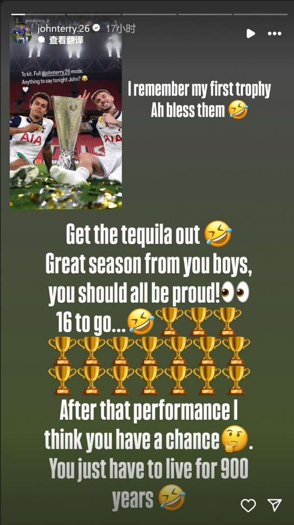 5月23日,这位曾为切尔西捧起16座冠军奖杯的后防铁闸作出回应。特里先是温情回忆:"我还清楚记得自己首个冠军的滋味。"随后话锋一转,用标志性的英式幽默调侃道:"不过你们还差我16个冠军,按照目前的速度,大概需要活到900岁才能追平。"值得一提的是,特里在评论中特意提及龙舌兰酒,这与他2012年欧冠夺冠后著名的"全副武装"庆祝场景形成巧妙呼应。