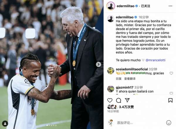 这位26岁的后防大将晒出了与安帅在训练场边的合影,配文中难掩感激之情:"执教生涯中能遇到您这样的导师,是我职业生涯最大的幸运。"值得注意的是,米利唐特别提到了安切洛蒂在不同场合展现的执教智慧,从战术指导到心理调适,处处体现着这位64岁老帅的独特魅力。