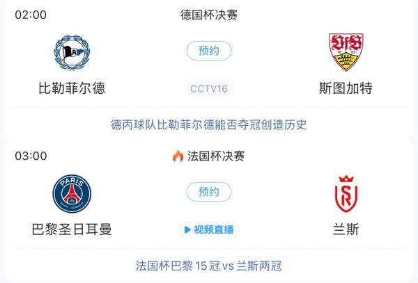 来源:360直播2025-05-24 16:35:59北京时间5月25日凌晨,欧洲足坛将迎来两场重要的杯赛决赛。首先在德国柏林奥林匹克球场,德丙冠军比勒菲尔德将挑战德甲球队斯图加特,这场德国杯决赛将于凌晨2点打响。