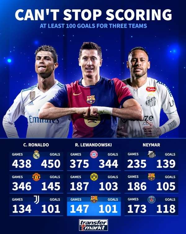 来源:360直播2025-05-26 15:57:33在欧洲足坛的历史长卷中,能够为三家不同俱乐部攻入至少100粒进球的球员屈指可数。最新数据显示,C罗、莱万多夫斯基和内马尔三位顶级射手都已达成这一非凡成就。
