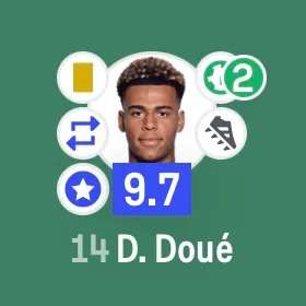 年仅19岁的杜埃成为比赛主宰者,他在进攻端贡献了两个进球和一次助攻。上半场,杜埃用一记禁区外的远射打破僵局,皮球直挂死角;下半场,他又通过机敏的跑位完成门前包抄破门,并精准助攻队友扩大优势。凭借这一统治级表现,杜埃被赛事官方授予全场最佳球员称号。数据平台Sofascore的统计显示,自2003/04赛季引入评分系统以来,杜埃以9.7分成为欧冠决赛单场最高得分球员,超越了库尔图瓦2022年的9.5分,以及梅西2011年和阿利森2019年并列的9.1分。有趣的是,杜埃是这一纪录榜单中最年轻的创造者,凸显了其非凡潜力。