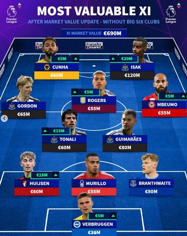 来源:360直播2025-06-01 18:49:52德国转会市场(德转)近日完成英超球员身价更新,除传统Big6豪门(曼城、利物浦、切尔西、曼联、阿森纳、热刺)外,首次发布联赛最贵阵容名单。该阵容以纽卡斯尔前锋伊萨克为核心,其身价高达1.2亿欧元,成为非Big6球员中的最高估值,突显中小球队投资策略的成效。