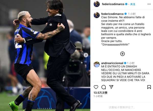 消息公布后,蓝黑军团后防中坚费德里科·迪马尔科在社交媒体上发布了一组极具纪念意义的照片。画面中记录了这位左路飞翼与恩师在夺冠庆典上的激情相拥、训练场边的促膝长谈等珍贵时刻。