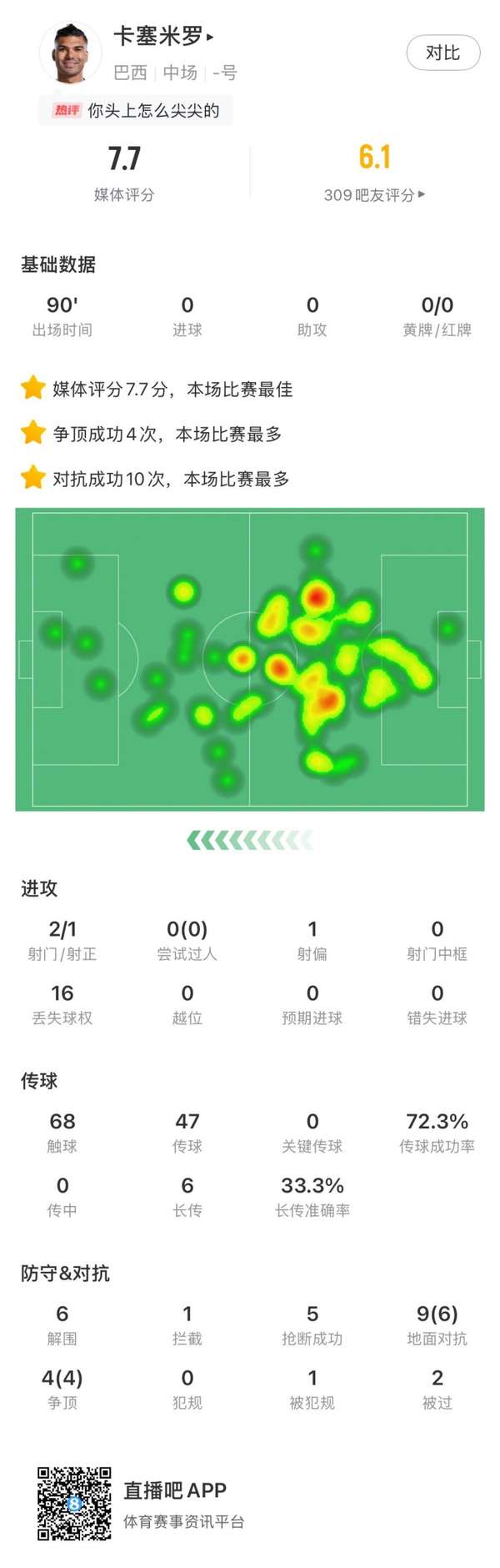 铁闸镇守!卡塞米罗六解围五抢断领衔巴西防线 获评队内最佳