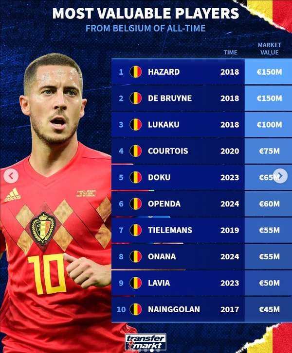 来源:360直播2025-06-07 07:26:08德国转会市场最新公布的统计数据显示,比利时国家队历史上涌现过多位身价惊人的球星。这份身价排行榜揭示了"欧洲红魔"黄金一代的市场价值巅峰。
